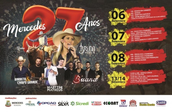 Mercedes completa em 13 de setembro 27 anos de emancipação e para comemorar a data uma programação especial está sendo preparada pela Administração Municipal. Os eventos contemplam inaugurações, rodeio, shows gratuitos, desfile cívico e café colonial.