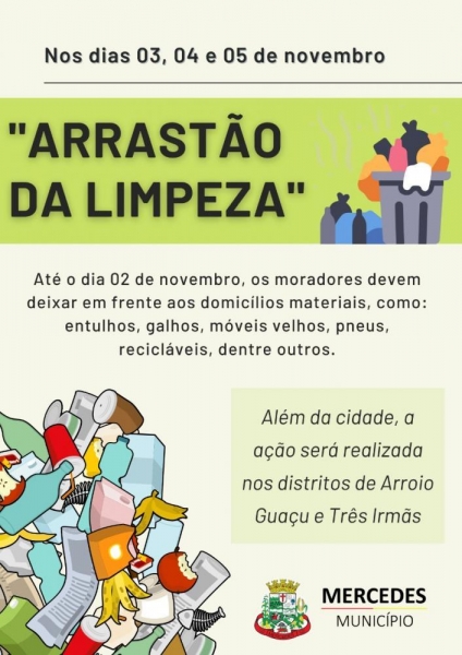 A prefeitura de Mercedes inicia hoje, (03) e nos dias 04 e 05 de novembro um novo “Arrastão de Limpeza”. Os moradores devem deixar em frente aos domicílios materiais, como: entulhos, galhos, móveis velhos, pneus, recicláveis, dentre outros. Além da cidade, a ação será realizada nos distritos de Arroio Guaçu e Três Irmãs.