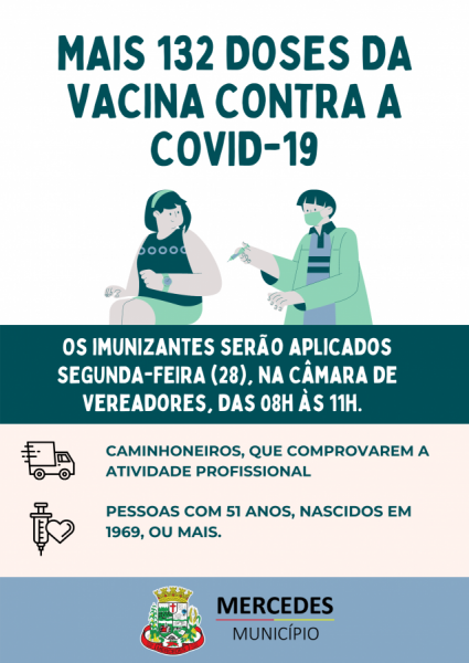 Serão destinados 20 imunizantes para caminhoneiros, será necessário comprovar a atividade profissional, além de pessoas com 51 anos, nascidos em 1969, ou mais. Os imunizantes serão aplicados na Câmara de Vereadores, das 08h às 11h.