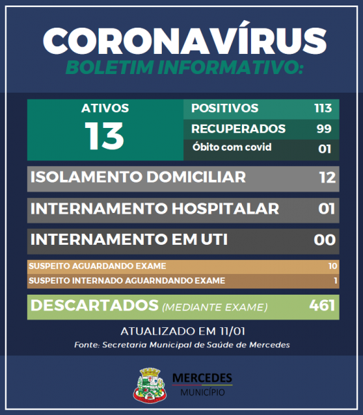 A Secretaria de Saúde de Mercedes atualizou na tarde desta segunda-feira (11), os números sobre o monitoramento dos casos de COVID-19 no município.