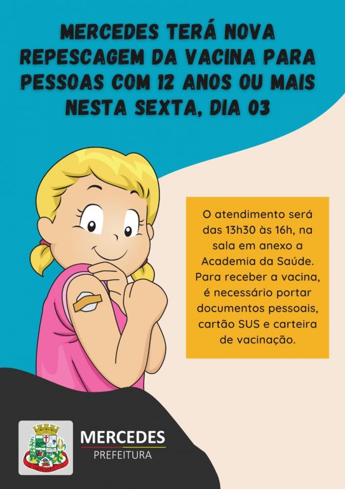 Com o objetivo de aumentar ainda mais a o número de pessoas vacinadas contra a Covid-19, a Secretaria de Saúde de Mercedes irá realizar amanhã, dia 03, mais uma repescagem da vacina.