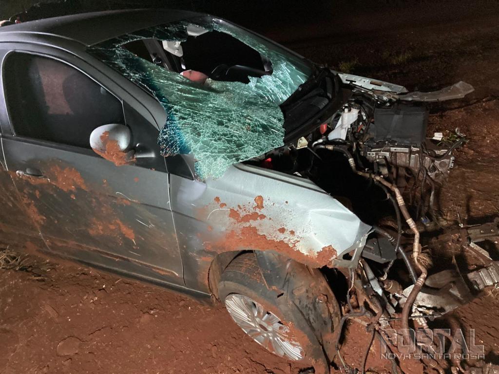 Um Fiat Siena ficou com a frente totalmente destruída e o motor arrancado, após uma mulher de 40 anos bater em um poste na “Curva dos Açudes”, estrada municipal que liga a cidade de Nova Santa Rosa ao distrito de Alto Santa Fé.