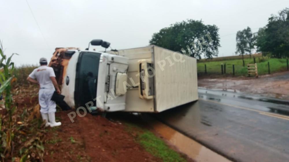 O motorista de um caminhão Ford bau refrigerado perdeu o controle da direção e tombou na rodovia estadual de prefixo PR-182, trecho que liga os município de Palotina e Francisco Alves.