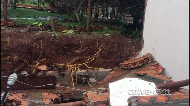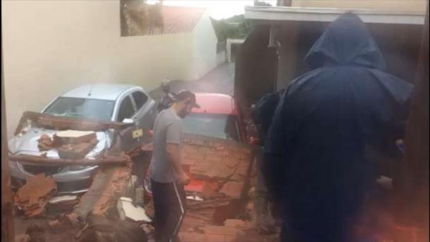 O muro de uma residência desabou e atingiu carros com a força da água, na manhã desta sexta-feira (31), no Bairro Canadá, em Cascavel.
