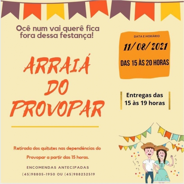 Com o objetivo de arrecadar fundos para serem utilizados em ações no município, o Provopar de Mercedes promove nesta quarta-feira (11), um arraiá. As entregas acontecem na sede da entidade, das 15h às 20h. A ação será realizada no formato drive-thru.