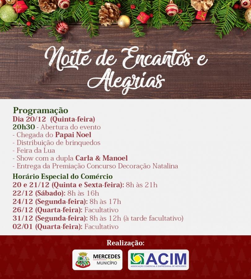 A Administração de Mercedes e a Associação Comercial e Empresarial de Mercedes (ACIM) desenvolvem nesta quinta-feira (20), na Avenida João XXIII em frente à Praça Willy Barth, a Noite de Encantos e Alegrias.