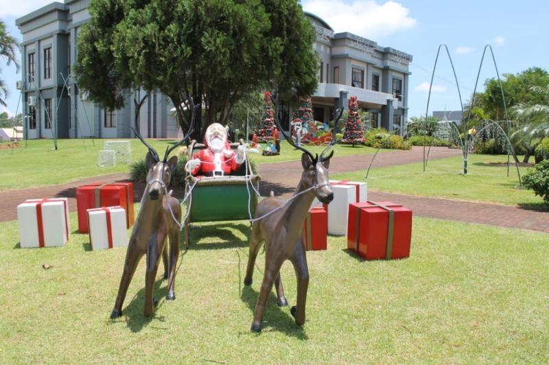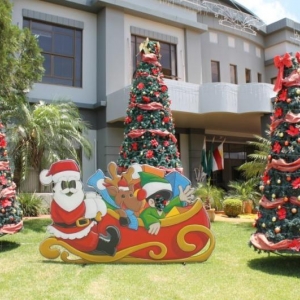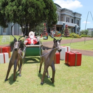 O espaço recebeu árvores de natal, trenó, painel de fotos, entre outros adereços iluminados que proporcionar um belo espetáculo noturno.