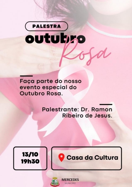 As atividades do Outubro Rosa seguem a todo vapor em Mercedes. Hoje (13), às 19h30, na Casa da Cultura, será realizada a palestra “Orientação e prevenção do câncer de mama”, com o Ginecologista Dr. Ramon de Jesus.