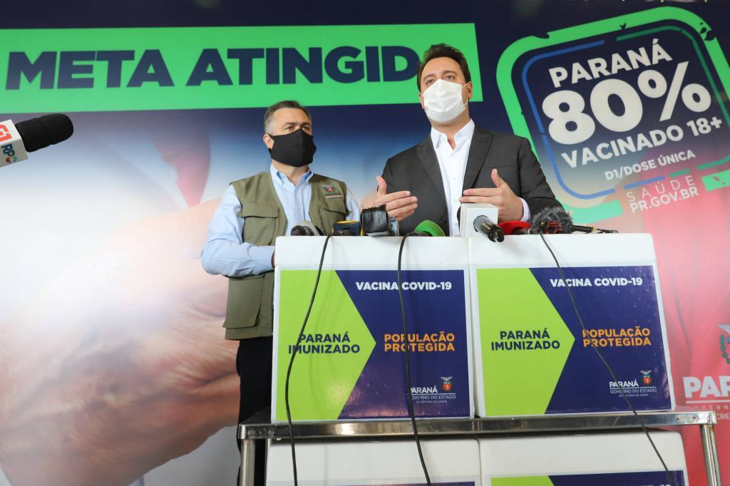 O Paraná alcançou nesta terça-feira (17), com duas semanas de antecedência, a simbólica marca de 80% da população adulta imunizada com a primeira dose (D1) ou dose única (DU) da vacina contra a Covid-19 – a expectativa do Governo do Estado era que a meta fosse batida apenas no fim deste mês. O índice foi celebrado pelo governador Carlos Massa Ratinho Junior durante visita ao Centro de Medicamentos do Paraná (Cemepar), local em que as vacinas ficam armazenadas em Curitiba.