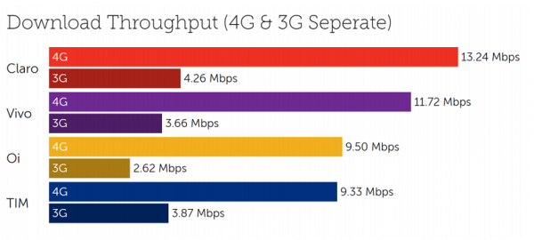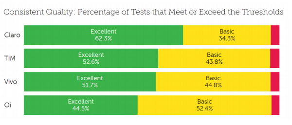 A pesquisa daTutela analisou dados de 403 bilhões de acessos móveis no Brasil, entre 1º de janeiro e 31 de março. Os dados foram obtidos de 3 mil aplicativos parceiros, que usam tecnologia da consultoria. De acordo o relatório, a Claro apresenta 62,3% dos downloads no padrão de qualidade excelente- 10% acima do segundo colocado. A TIM e a Vivo seguem muito próximas com 52,6% e 51,7%, respectivamente. Por último, a Oi aparece com 44,5%.