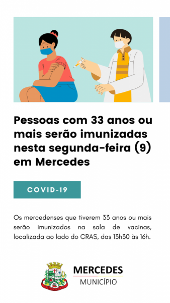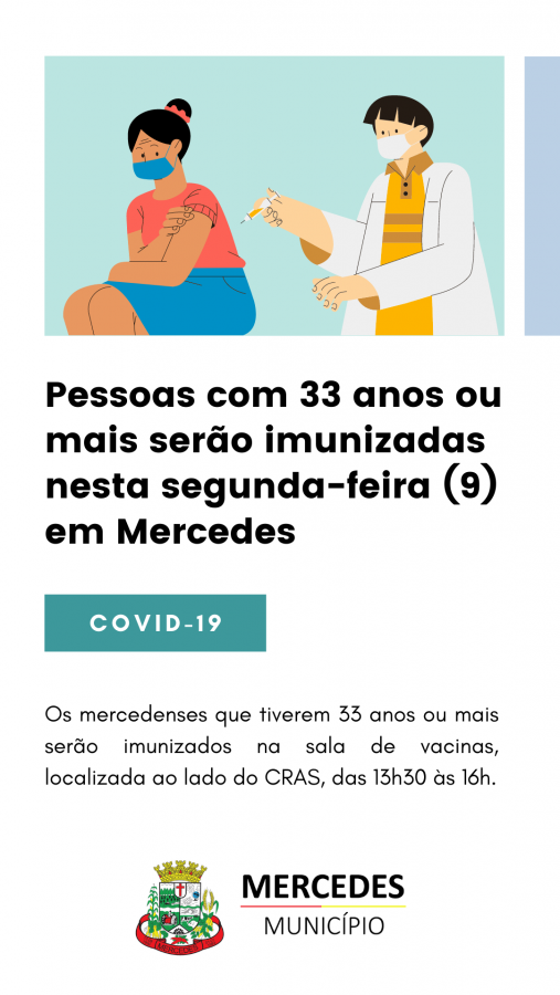 Os mercedenses que tiverem 33 anos ou mais serão imunizados na sala de vacinas, localizada ao lado do CRAS, das 13h30 às 16h.