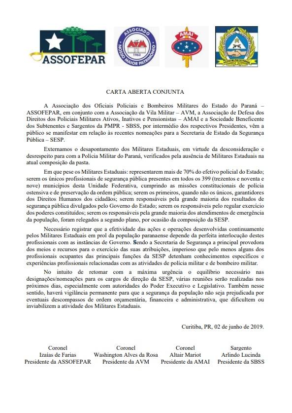 Em carta divulgada no domingo (2), as associações destacam que 70% do efetivo policial do estado é composto por militares estaduais. Eles estão presente em 399 municípios do Paraná. "Externamos o desapontamento dos militares estaduais, em virtude da desconsideração e desrespeito para com a Polícia Militar do Paraná, verificados pela ausência de Militares Estaduais na atual composição da pasta".