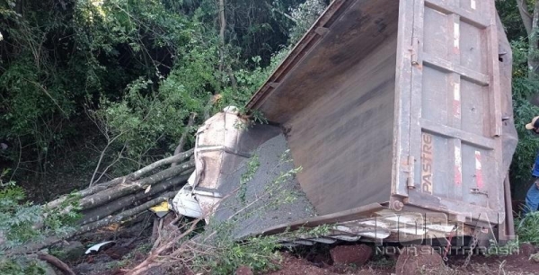 O condutor disse que faltou freio do veículo e ele passou para pista contrária, atingiu uma árvore e em seguida desceu um barranco de aproximadamente 8 metros, ficando prensando na cabine do veículo.