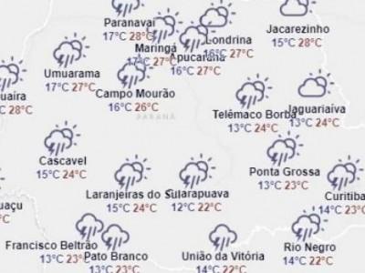 Em Londrina e Apucarana, os termômetros ocilam entre 16ºC e 27ºC. Já em Maringá a mínima prevista é de 17ºC e a máxima 27ºC.