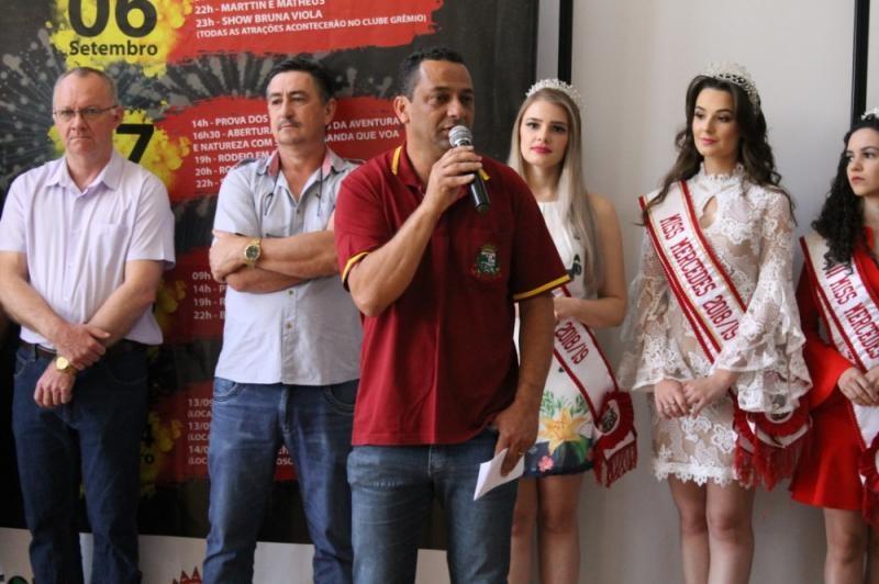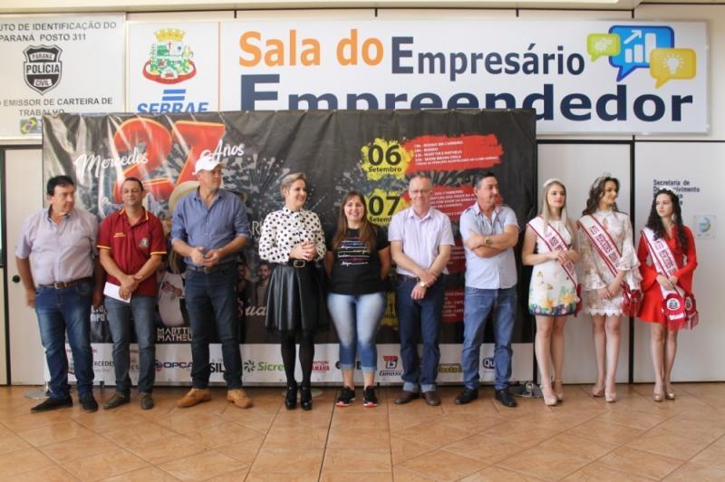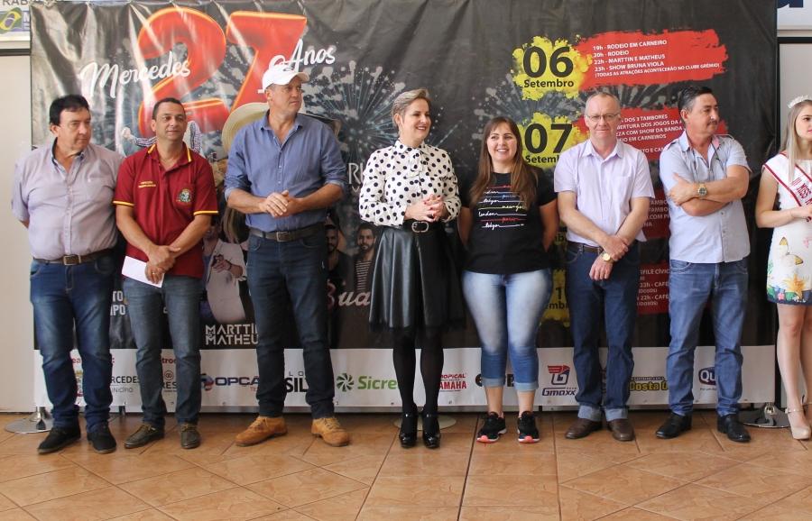 A administração Municipal anunciou oficialmente, na manhã desta quinta-feira (29), a programação do 27° Aniversário de Mercedes. O lançamento da festa foi realizado no paço municipal ocasião em que a Prefeita Cleci Loffi e o Secretário de Esportes, Lazer e Turismo e Presidente da CCO Edson Vilar apresentaram à imprensa e convidados a programação, que contempla inaugurações, rodeio, shows gratuitos, desfile cívico e café colonial.