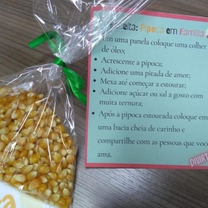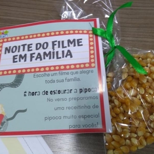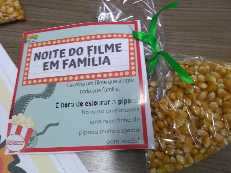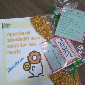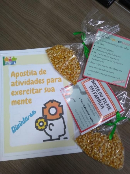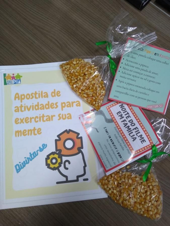 Foram entregues uma apostila com atividades de atenção, percepção e memória, com o objetivo de melhorar e manter a capacidade de concentração e atenção, além de uma atividade em família, denominada: Noite do Filme em Família, com o objetivo de fortalecer os vínculos familiares e realizar uma atividade intergeracional, incluindo os idosos da família na atividade.