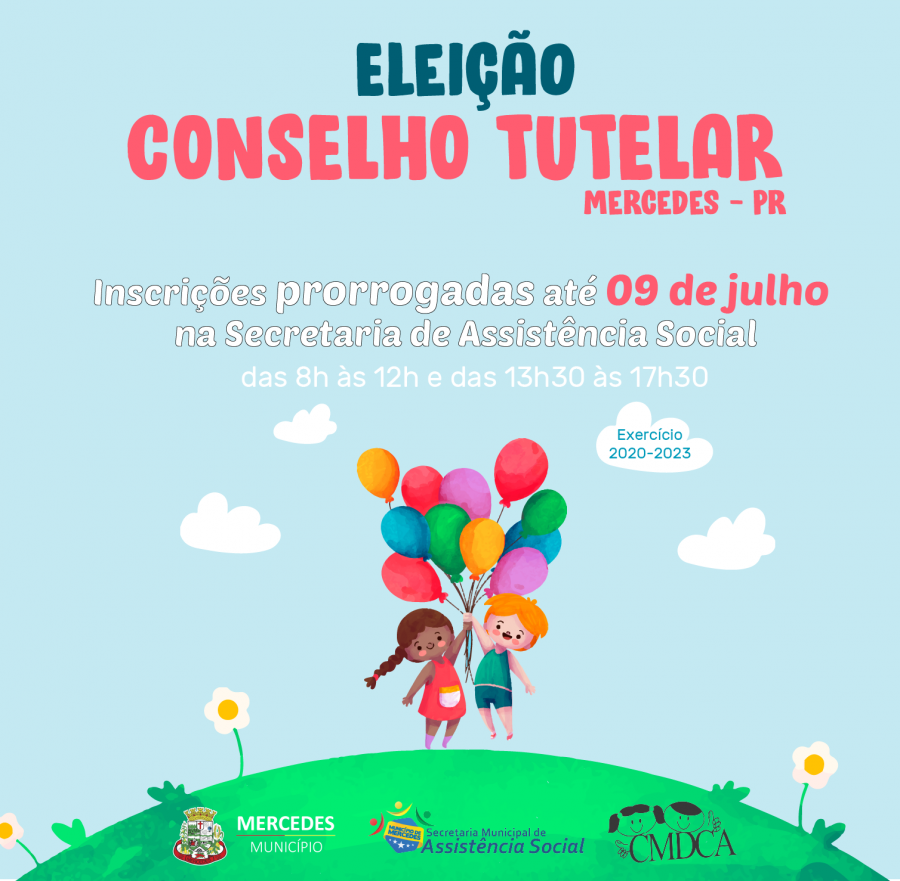 O Conselho Municipal dos Direitos da Criança e do Adolescente de Mercedes prorrogou o prazo de inscrição para a eleição dos Conselheiros Tutelares (exercício 2020-2023). O prazo foi ampliado para até a próxima terça-feira (09), às 17h30.