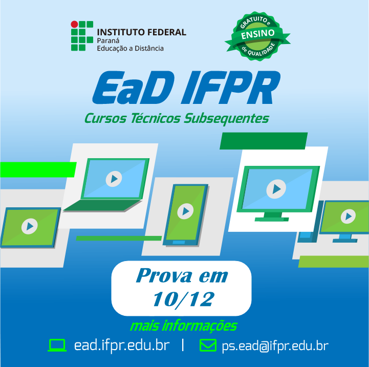 As provas para o processo Seletivo EAD 2019 do Instituto Federal do Paraná (IFPR), que ofertará cursos gratuitos técnicos na modalidade subsequente de Administração e Vendas em Mercedes, vão ocorrer na próxima segunda-feira (10) na Escola Municipal Tiradentes.