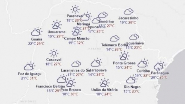 Em Cascavel a previsão do Simepar é para um dia de muitas nuvens e temperaturas que devem variar entre 18 e 27 graus.