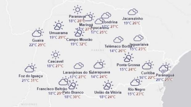 Nesta quinta-feira as condições atmosféricas são desfavoráveis às chuvas no Paraná. Há previsão de pancadas de chuva apenas para Paranaguá onde a temperatura máxima deve chegar aos 25 graus.