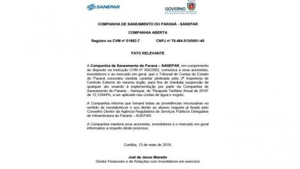 "A Companhia de Saneamento do Paraná - SANEPAR, em cumprimento ao disposto na Instrução CVM nº 358/2002, comunica a seus acionistas, investidores e ao mercado em geral, que o Tribunal de Contas do Estado do Paraná concedeu medida cautelar pleiteada pela 2ª Inspetoria de Controle Externo do mesmo órgão, para fins de imediata suspensão de qualquer ato visando à implementação por parte da Companhia de Saneamento do Paraná - Sanepar, do "Reajuste Tarifário Anual de 2019" de 12,12944%, a ser aplicado nas contas de água e esgoto".
