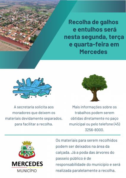 A Administração do Município de Mercedes informa aos proprietários dos imóveis urbanos particulares que desejam fazer a poda de árvores dentro do terreno que as equipes vão passar fazendo a recolha e trituração dos galhos a partir de hoje, segunda-feira (31) até a próxima quarta-feira (02). Haverá ainda, a recolha de entulhos.