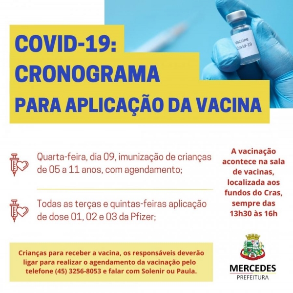 Na próxima quarta-feira, dia 16, serão aplicadas doses pediátricas em crianças entre de 05 a 11 anos. Para receber a vacina, os responsáveis deverão ligar para realizar o agendamento da vacinação pelo telefone (45) 3256-8053 e falar com Solenir ou Paula.