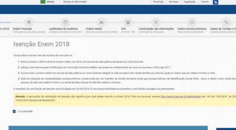 Para pedir a isenção, o candidato deve acessar a página do Participante do Enem e inserir seu CPF e data de nascimento. Em seguida, aparecerá uma explicação sobre as situações que garantem a isenção, para o candidato verificar se ele se enquadra em alguma delas.