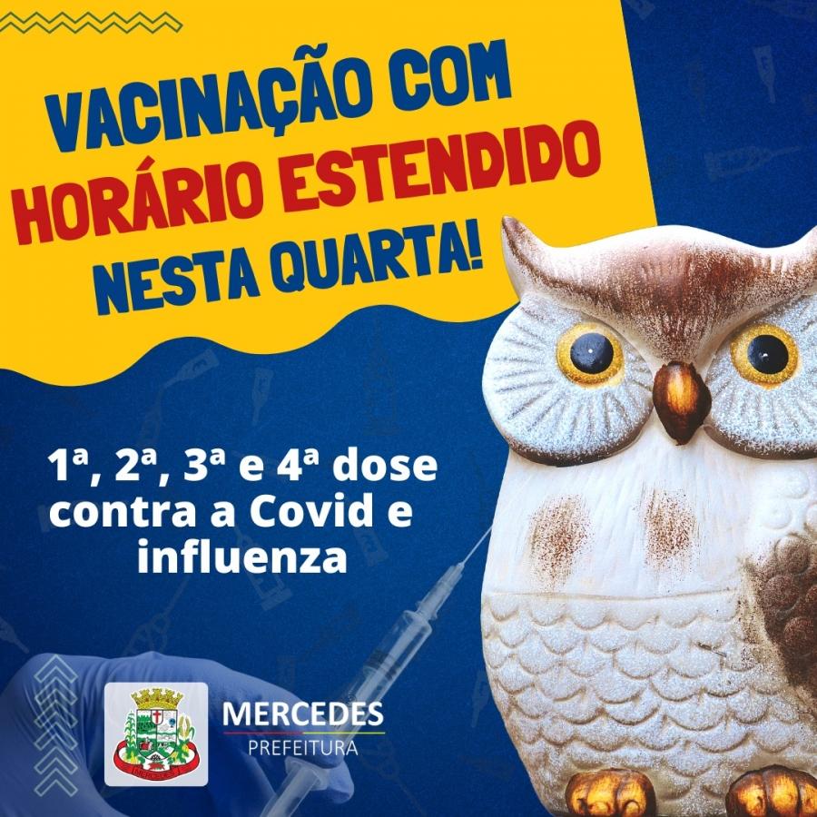 Buscando ampliar ainda mais a cobertura vacinal, a Sala de Vacinas de Mercedes atenderá com horário estendido nesta quarta-feira (20). O atendimento será das 13h30 até às 19h e serão aplicadas 1ª, 2ª, 3ª e 4ª dose contra a Covid, inclusive em crianças com cinco anos ou mais, além de vacinação contra a influenza.