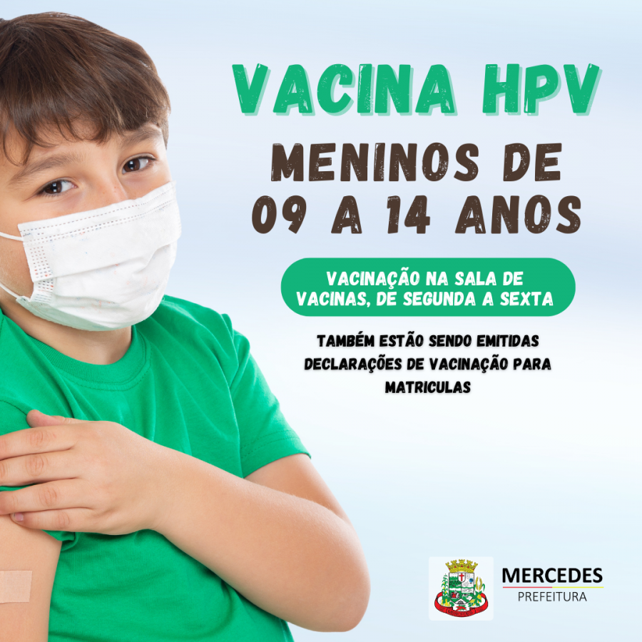 A Secretaria de Saúde de Mercedes informa que iniciou hoje a ampliação da oferta da vacina HPV para meninos de 09 a 14 anos de idade, igualando as meninas que já recebiam esse imunizante nesta faixa etária.