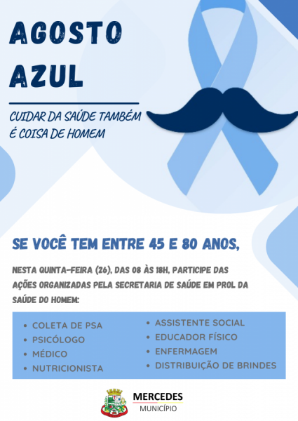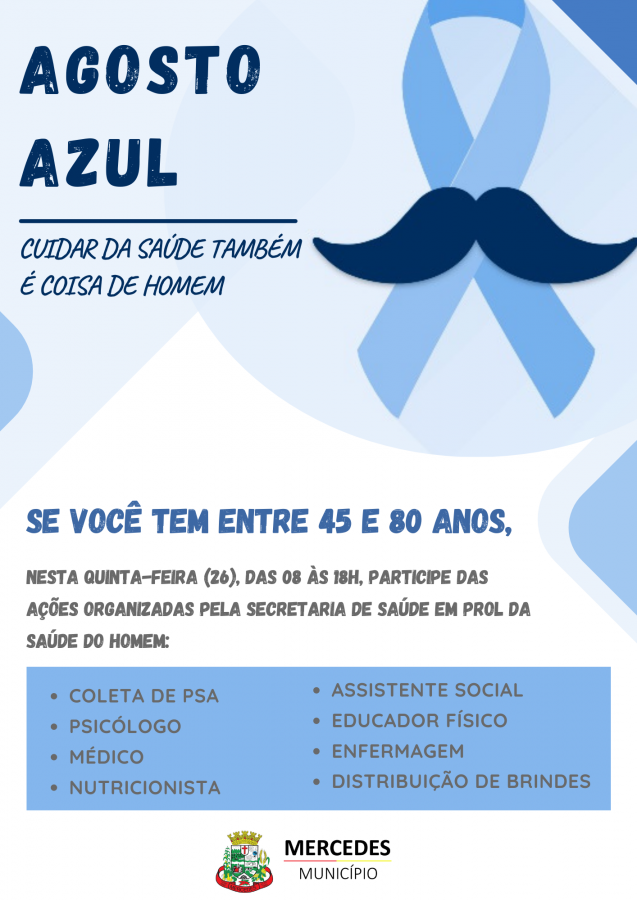 Com o objetivo de sensibilizar e conscientizar a população masculina acima de 40 anos sobre a importância do cuidado com a saúde, a Secretaria de Saúde de Mercedes promoverá na próxima quinta-feira (26), em comemoração ao Agosto Azul, várias ações de conscientização sobre a saúde do homem. As atividades serão realizadas na academia da saúde, localizada aos fundo do CRAS, entre as 08 às 18h – não fechando para o almoço.
