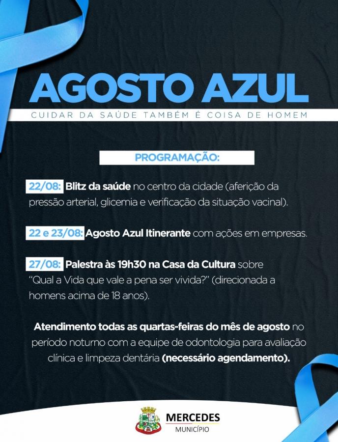 Com o objetivo de sensibilizar e conscientizar a população masculina sobre a importância do cuidado com a saúde a Secretaria de Saúde de Mercedes está desenvolvendo durante o mês de agosto, em comemoração ao Agosto Azul, várias ações de conscientização sobre a saúde do homem.