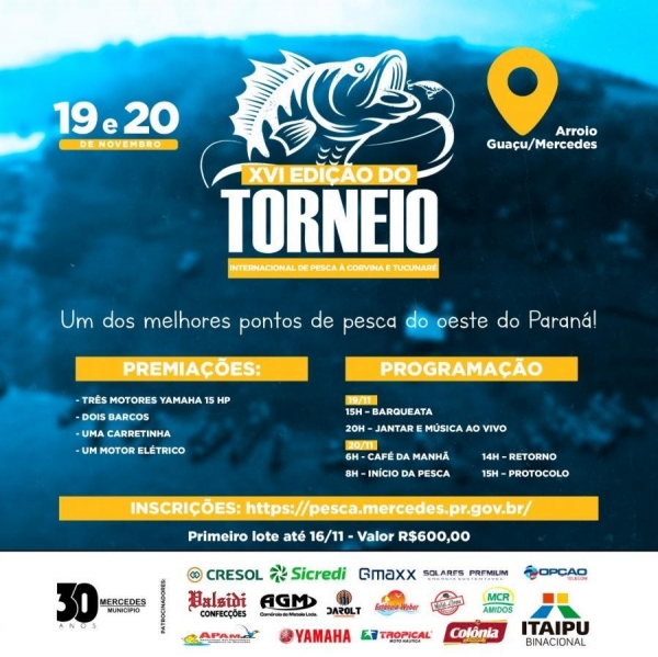 A Secretaria de Esporte, Lazer e Turismo de Mercedes realizará nos dias 19 e 20 de novembro, a XVI Edição do Torneio Internacional de Pesca à Corvina e Tucunaré, no Distrito de Arroio Guaçu, considerado um dos melhores pontos de pesca do oeste paranaense. O evento encerra a programação de 30 anos do Município.