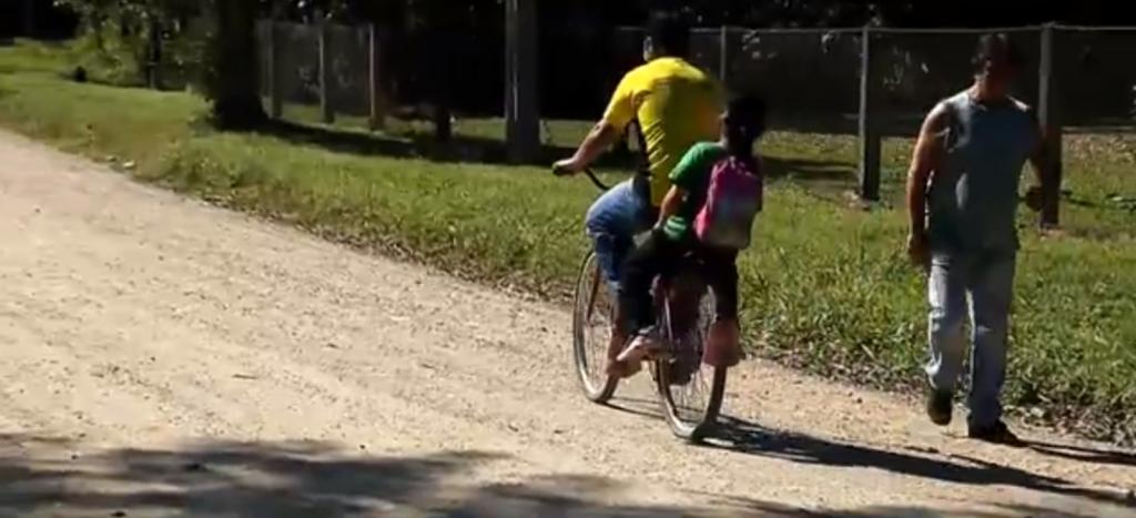Outra menina, de sete anos, vai de carona com o tio para a escola. São 4 km andando de bicicleta.