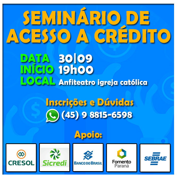 A atividade ocorre em parceria com o Sebrae e com todas as instituições financeiras presentes no município. Na ocasião haverá uma palestra com a instrutora Leani Nehring sobre acesso ao crédito além de um momento para troca de ideias junto as instituições financeiras.