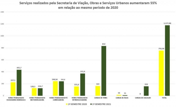 Dados divulgados pela Secretaria de Viação, Obras e Serviços Urbanos do Município de Mercedes apontam que os serviços executados pela pasta no primeiro semestre de 2021 aumentaram em 55%, no comparativo com o mesmo período de 2020.