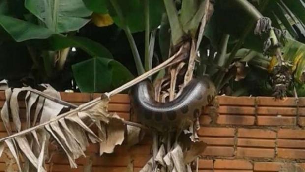 Conforme relatos da moradora, o réptil estava dormindo enrolado em uma bananeira. Após ser acordada por populares, a cobra desceu do muro e retornou ao seu habitat natural.