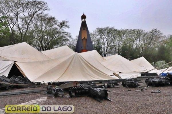 As tendas e demais instalações que estavam sendo finalizadas no local foram derrubadas pela força do vento, surpreendendo as equipes que trabalhavam na montagem.