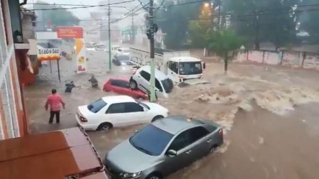 A forte chuva inundou ruas, arrastou veículos e deixou pessoas ilhadas em Assunção, no Paraguai, nesta sexta-feira (10).