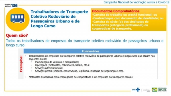 Os profissionais deverão apresentar no momento da imunização: carteira de trabalho ou crachá funcional; ou contracheque com documento de identidade; ou carteira de sócio (a) dos sindicatos de transportes (categoria profissional) ou cooperativa de transportes.