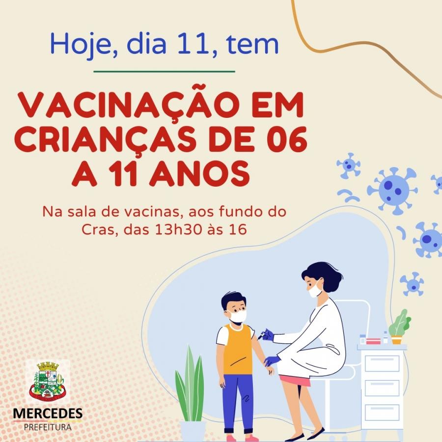 A Secretaria de Saúde de Mercedes dará sequência hoje, dia 11, na vacinação contra a Covid-19 em crianças de 06 a 11 anos. A aplicação dos imunizantes acontecerá na sala localizada aos fundos do Cras, das 13h30 às 16h.