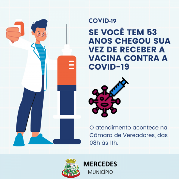 O Município de Mercedes começa a vacinar contra a Covid-19 pessoas com 53 anos ou mais nesta quarta-feira (16). Conforme a Secretaria Municipal de Saúde, o atendimento acontece na Câmara de Vereadores, das 08h às 11h.