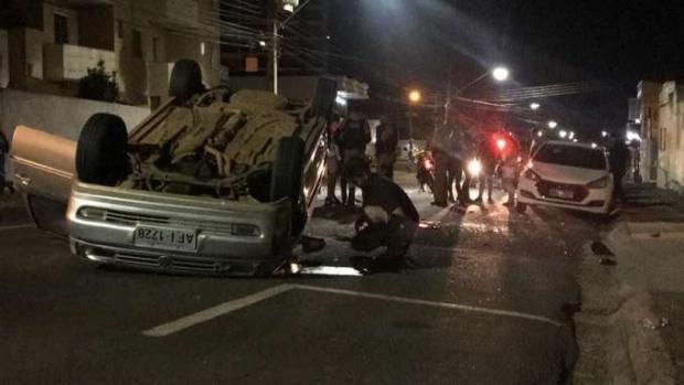 Após uma batida lateral com um veículo Cruze, um Gol capotou, ficando parado, com as rodas para o ar, sobre uma das faixas.