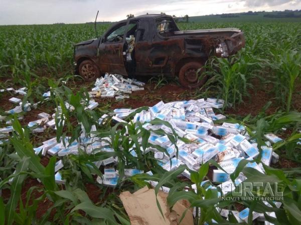 Nesta terça-feira (27), policiais militares de Nova Santa Rosa foram acionados para se deslocar até uma plantação de milho localizada as margens da estrada municipal que liga Nova Santa Rosa ao distrito de Planalto do Oeste, segundo informações no local havia um veículo abandonado com cigarros contrabandeados do Paraguai, chegando ao local, os policiais constataram o fato e em meio a lavoura estava o veículo Chevrolet Montana com placas NTZ-6302, segundo informações o condutor que não estava mais no local, perdeu o controle do veículo e a caminhonete saiu da pista e capotou por diversas vezes, espalhando a carga de cigarros pela lavoura.