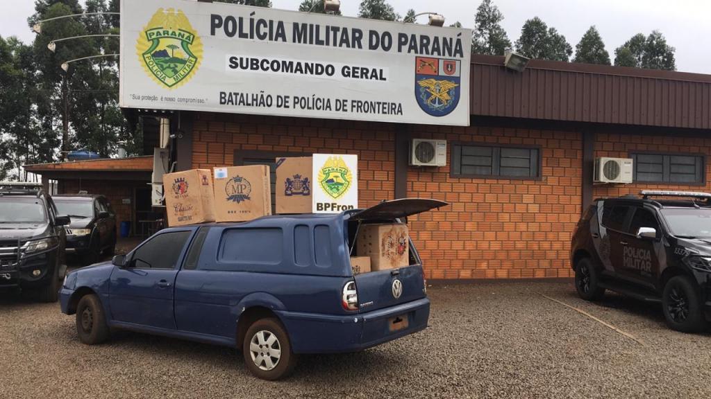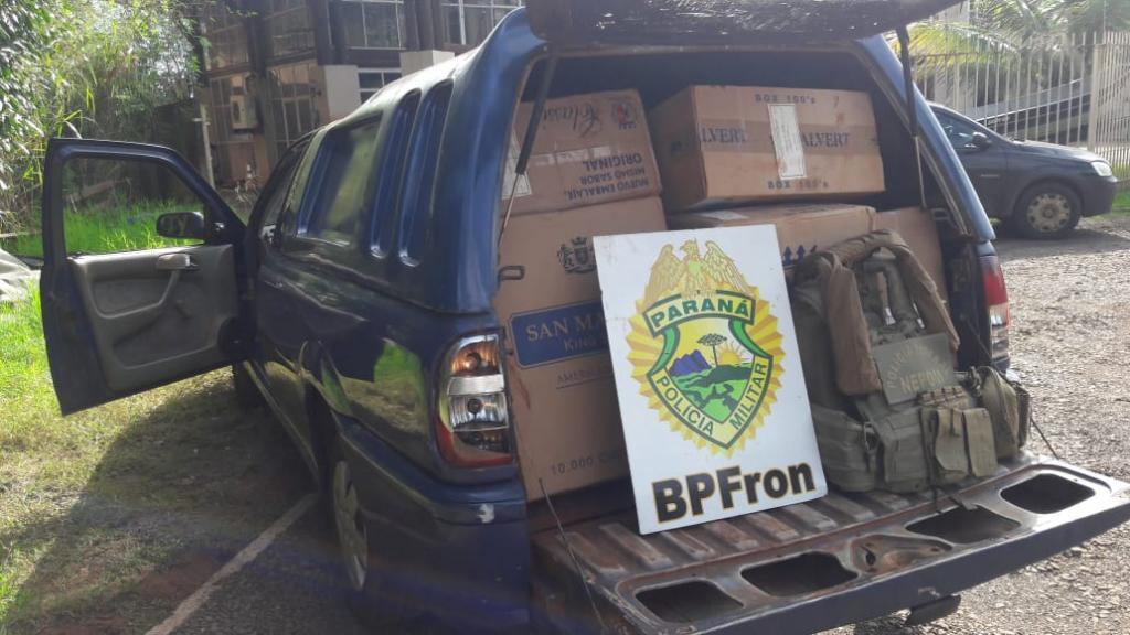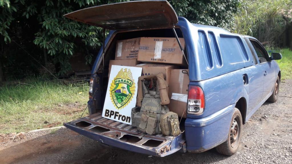 No local foi encontrado e apreendido um veículo VW Saveiro carregado com várias caixas de cigarros de origem paraguaia.