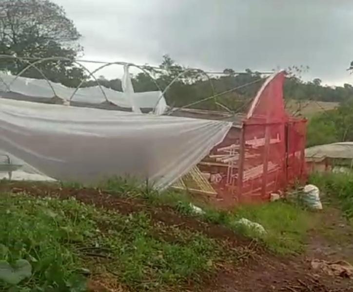Outro local que registrou prejuízos foi uma propriedade rural na comunidade da Gleba. Duas estufas de verduras foram danificadas, sendo que uma foi ao chão completamente. Árvores também caíram na propriedade rural.