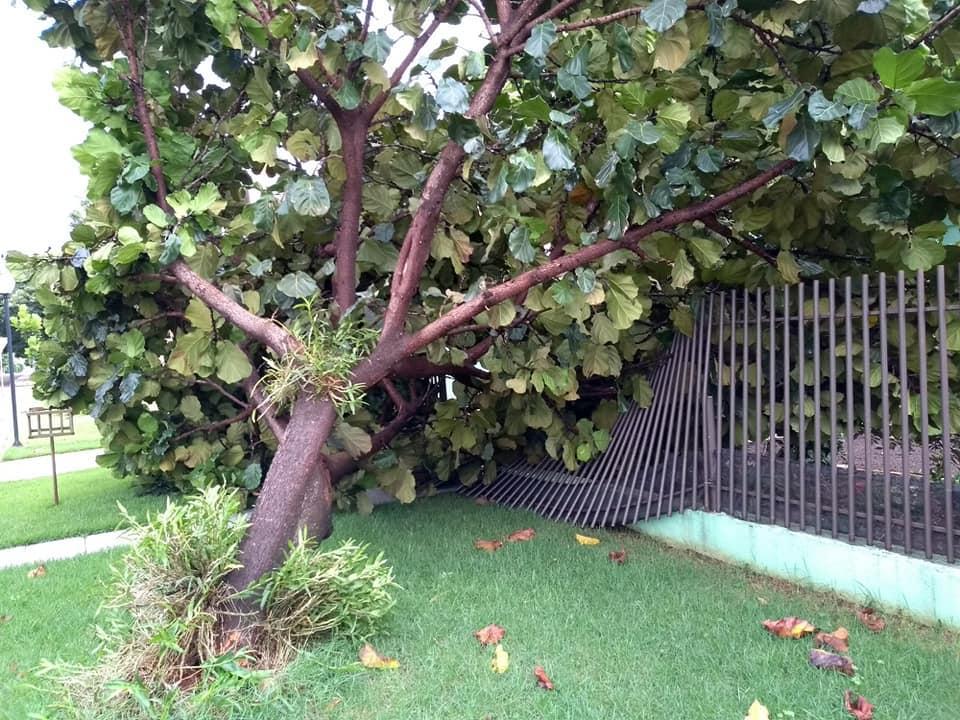 Com o peso da árvore a cerca cedeu e o portão eletrônico foi danificado.