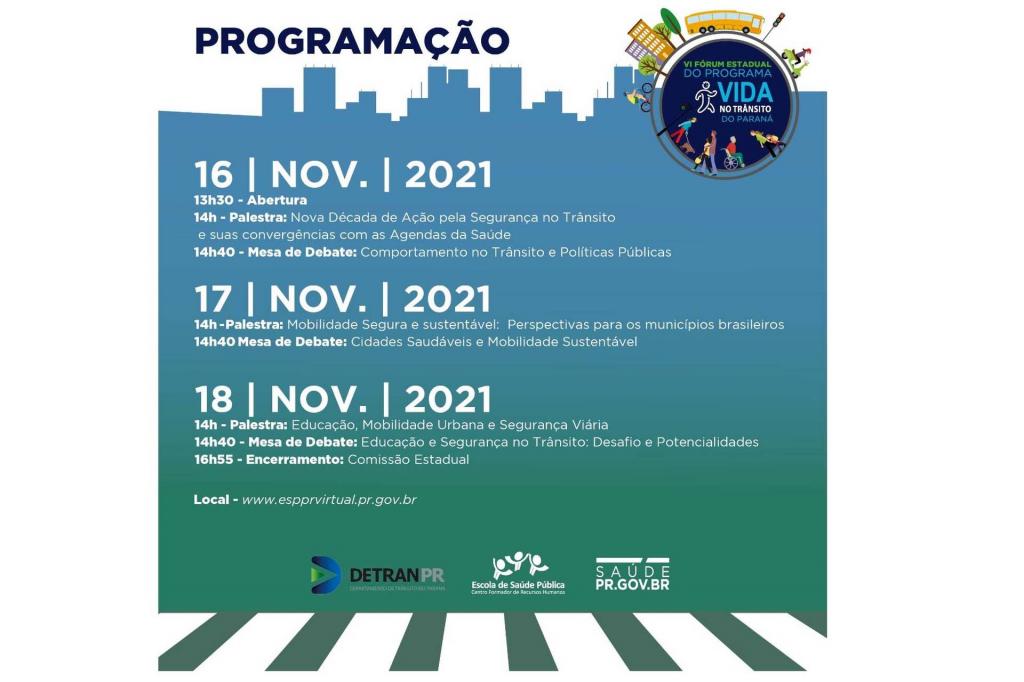 O Projeto Vida no Trânsito do Paraná (PVT-PR), coordenado pelo Departamento de Trânsito do Paraná (Detran-PR) e a Secretaria de Estado da Saúde, disponibiliza de forma online, nos dias 16, 17 e 18 de novembro, o VI Fórum Estadual do Programa Vida no Trânsito do Paraná.
