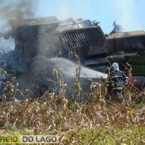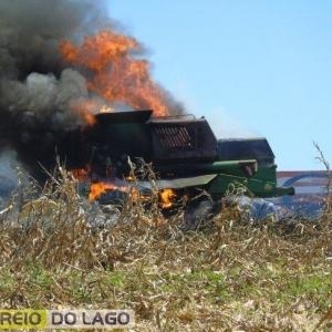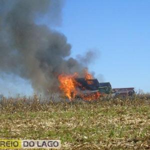 Quando os agentes da Defesa Civil e militares do Corpo de Bombeiros chegaram no local, as chamas já haviam consumido a colheitadeira.