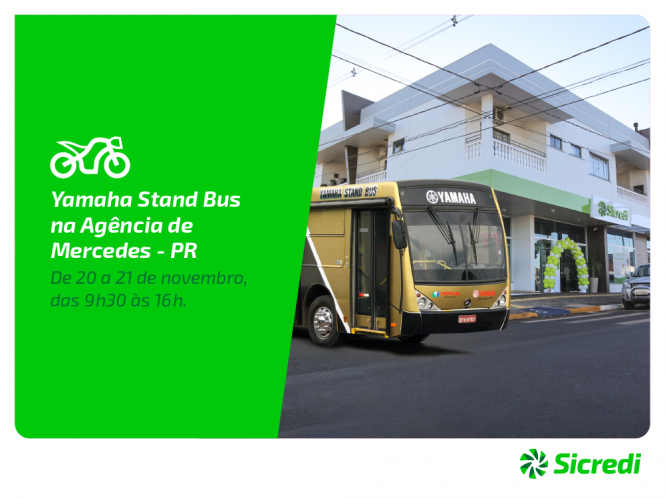 Nesta terça e quarta-feira (20 e 21) das 09h30 às 16h, estará em frente da agência Sicredi de Mercedes o Yamaha Stand Bus.
